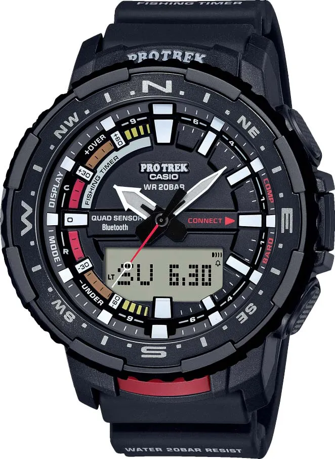 На борту модели вы найдете Quad Sensor: термометр, барометр, высотомер, компас и шагомер, данные о заходе и восходе Солнца, отображение фаз Луны и уровня приливов и отливов, двойную автоматическую подсветка, прочное минеральное стекло и еще более десятка функций! Из особенностей часов стоит выделить водозащиту в 200 метров, которая не часто встречается в серии Pro Trek, а также таймер рыбалки, который основан на фазах Луны и благодаря которому, часы покажут оптимальное время для наилучшего улова.