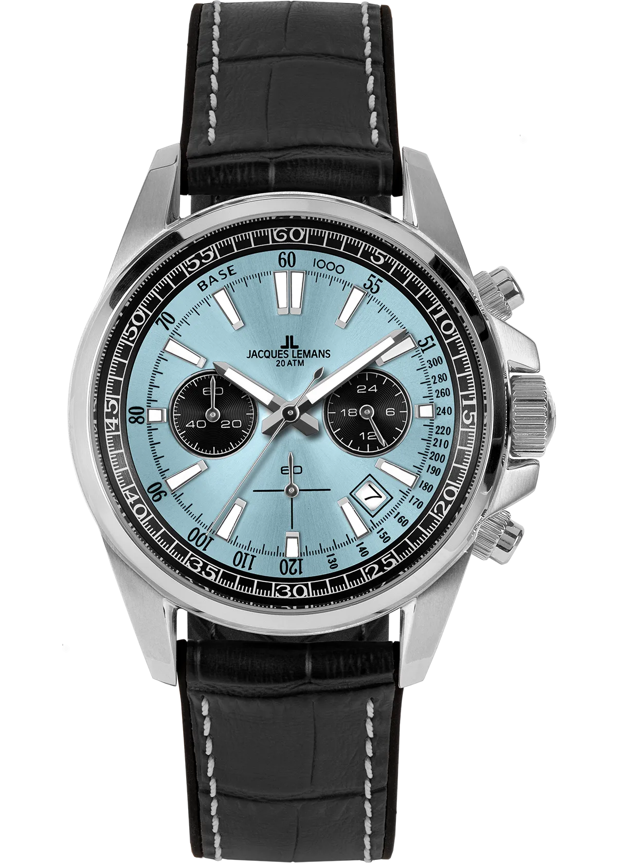 Кнопки хронографа продуманного размера удобно использовать, а для рельефной заводной головки предусмотрена дополнительная защита. На черном циферблате с полировкой в виде солнечных лучей расположены крупные часовая и минутная стрелки и риски с люминесцентным покрытием, которое помогает определить время даже в темноте. Хорошо читаются дополнительные индикаторы 24-х часов, счетчики минут и секунд, окошко даты.