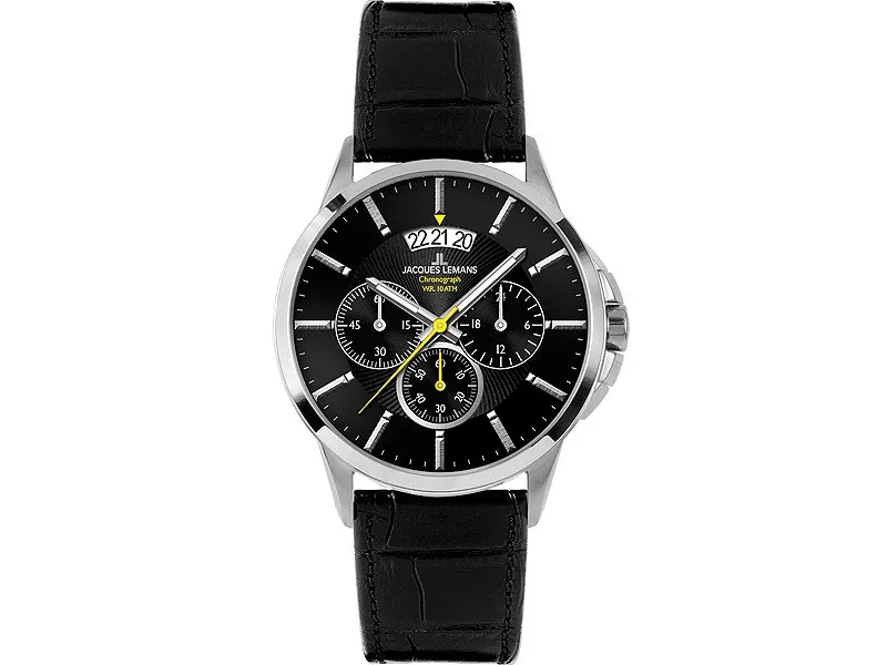 Волнообразное гильоше придает циферблату черного цвета эффектный объем. В модели предусмотрены минутный и секундный накопители, индикатор 24-х часов и оригинальное окошко даты. Стрелки часов и минут покрыты специальным люминесцентным составом, который накапливает свет и позволяет определить время даже в темноте.