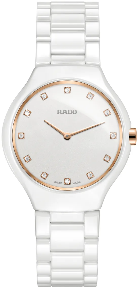 True Thinline по праву могут считаться революционными часами Rado. Эти кварцевые часы пополнили коллекцию в 2011 году и являются самыми тонкими часами Rado, при создании которых впервые был использован революционный корпус конструкции моноблок, изготовленный из высокотехнологичной керамики Эти долговечные часы, гарантирующие своему владельцу легкость, устойчивость к появлению царапин и комфорт, теперь также радуют глаз чарующим сиянием бриллиантов.